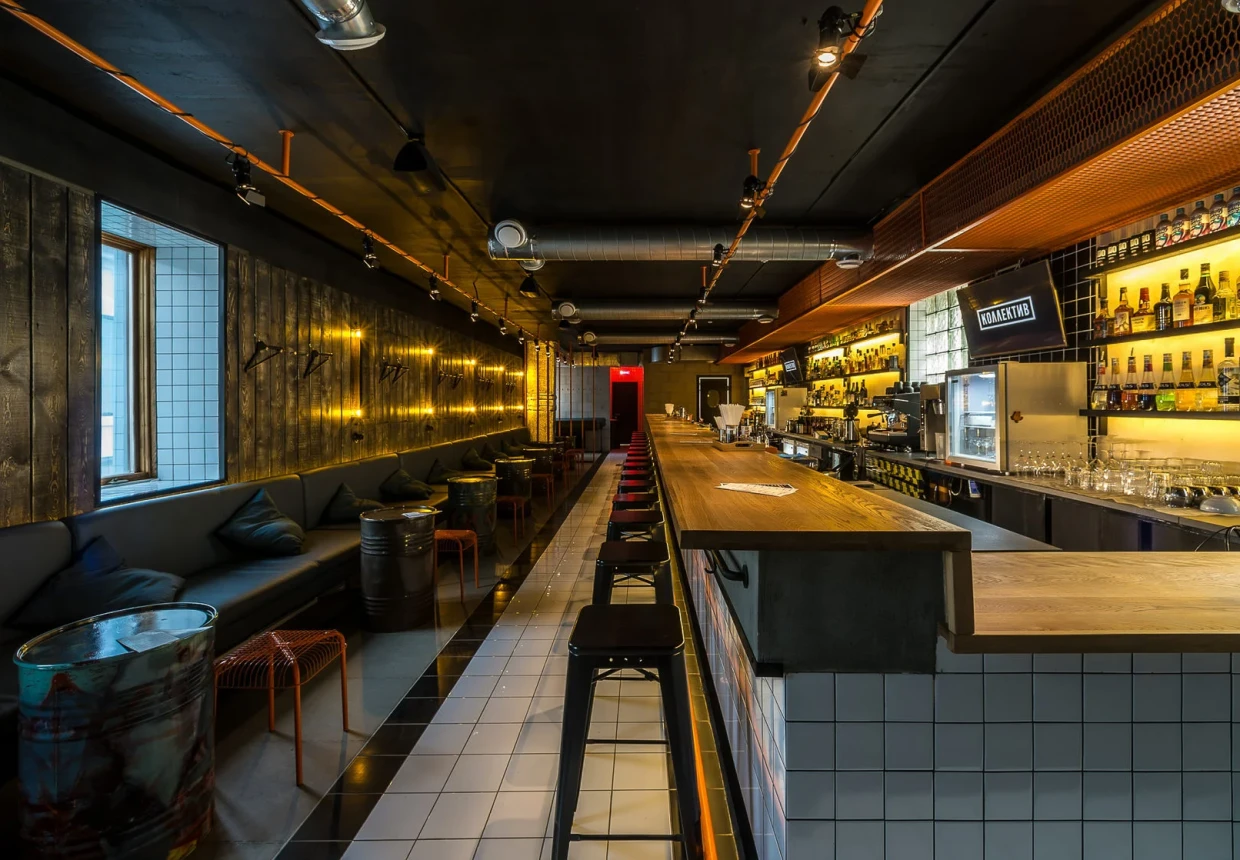 Коллектив — независимый коктейльный бар в Екатеринбурге, в котором есть свои правила (простые и правильные, но почему-то не всем понятные). Снаружи — неприметная серая дверь с микровывеской «Подарки к праздникам». Внутри должен был расположиться вейп-шоп, но не срослось: о прежнем замысле напоминают огромные вентиляционные трубы. Длинная барная стойка, диваны, табуреты, бочки — пространство легко подстроить под себя.