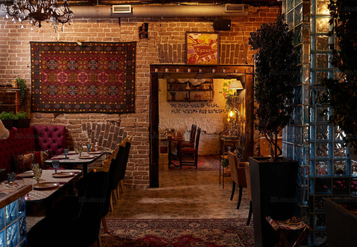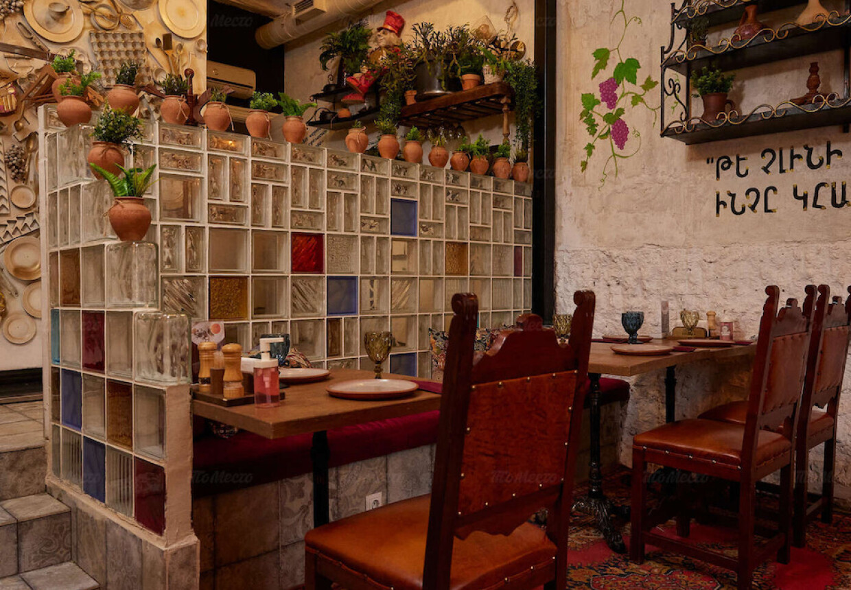 Интерьер ресторана оформлен в современном этническом стиле. В дизайне использовали кирпичную кладку и горшочки с живыми растениями. Кавказский колорит подчёркивают предметы национального быта, аутентичные ковры и фразы на армянском языке на стенах.