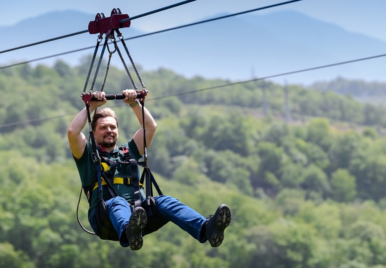 Zipline – это самый доступный аттракцион в Скайпарке по порогу преодоления страха. Захватывающий дух полёт на троллее над Ахштырским ущельем со скоростью 60 км/час – это возможность почувствовать себя птицей, парящей в небе. 700 метров – именно такое расстояние вы пролетаете на одном дыхании от одной стороны ущелья до другой на высоте 330 метров над уровнем моря.